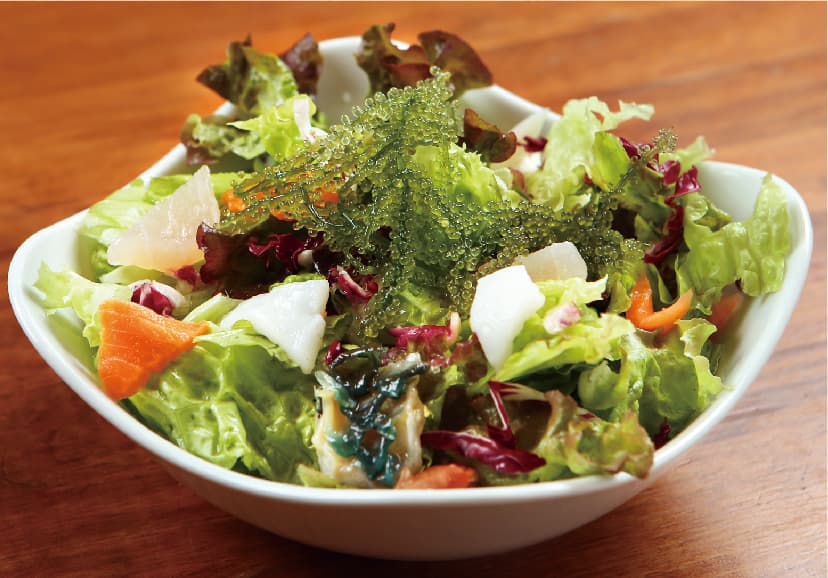 魚介類と海藻、海ぶどうの新鮮サラダ。