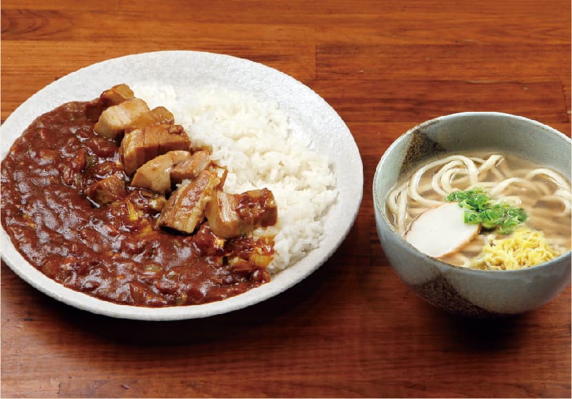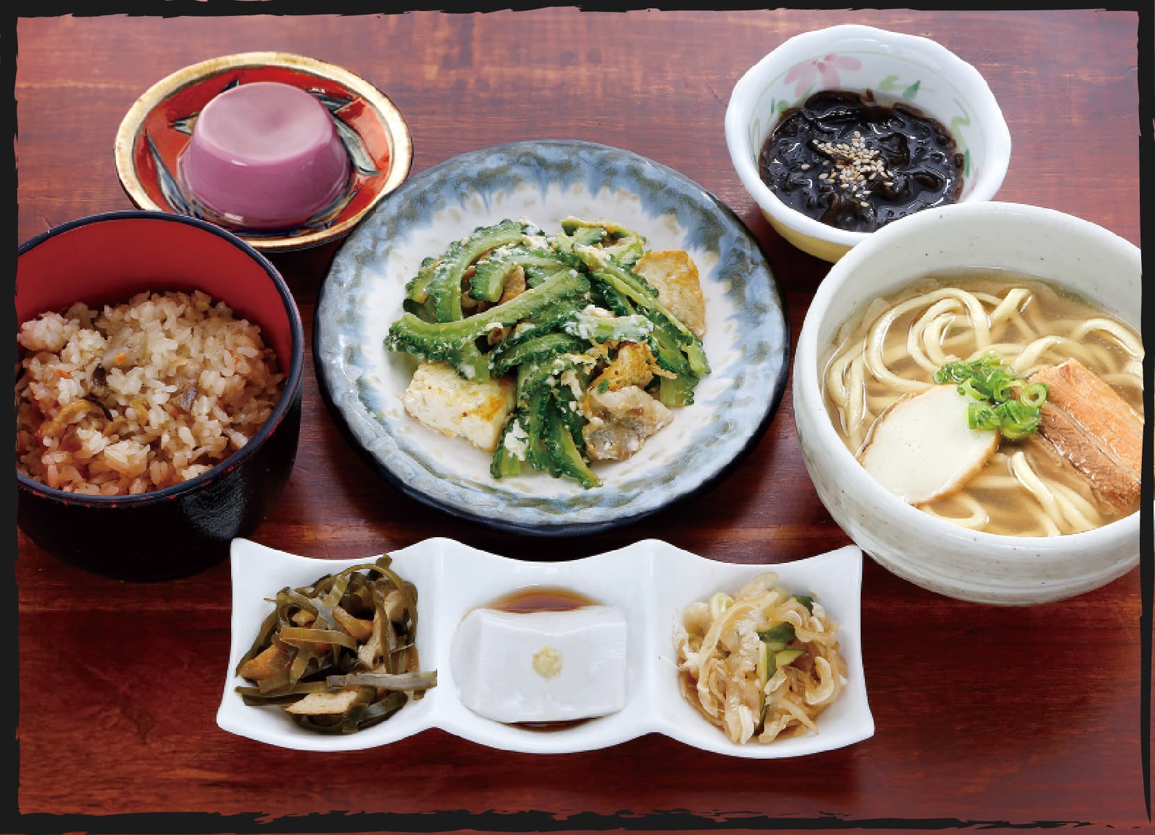 ミニゴーヤーチャンプルー、沖縄そば(小)、ジューシー、ジーマーミ豆腐(ピーナッツ豆腐)、小鉢、クーブイリチー、ミミガー、甘物